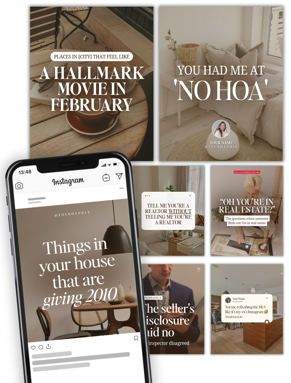Every month covers a full range of real estate content: market insights, buyer and seller education, home tips, community content, and engagement posts. Three different design styles are available so you can choose what fits your brand and rotate to keep your feed from looking repetitive.